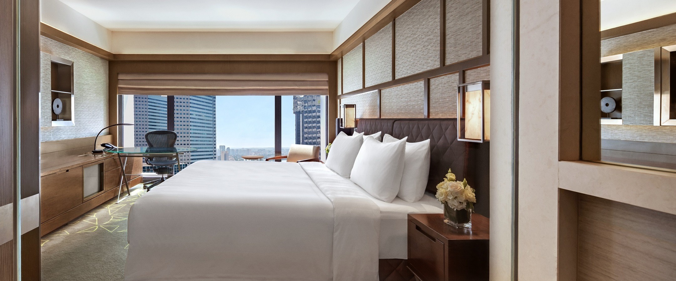 With views of the city, this luxurious room has been designed with a refreshing palette of nature-inspired green tones infused with subtle local touches.