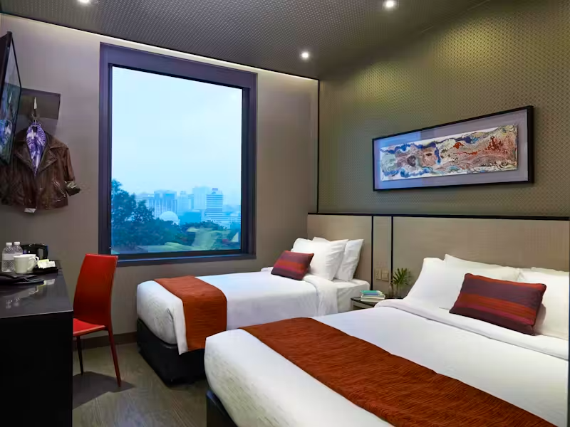 Village Hotel Bugis offers a vibrant stay in Singapore's cultural precinct, featuring contemporary rooms with city views. The hotel includes an outdoor pool, a fitness centre, and multiple dining options. With Bugis MRT nearby, guests enjoy convenient access to shopping, dining, and cultural sites, perfect for exploring the city. | Distance to Changi Airport: 16.1 km, 14 min drive | Nearest Train Station: Bugis (DT14|EW12) - 8 min walk | Nearest Shopping Mall: Bugis Junction – 7 min walk